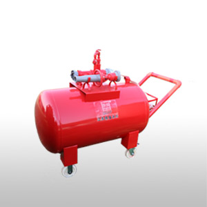 本装置采用推车形式,在火灾发生初期时,机动、灵活地推动该装置到灭火现场进行灭火。本装置可独立作为消防防卫器材,也可配合大型固定式泡沫灭火系统起辅助补救作用。该移动式泡沫灭火装置可由消防管网或城市供水管网、消防车、手抬消防泵提供压力水源,经负压比例混合器按比例(3%或6%)与泡沫贮罐内的泡沫液形成泡沫混合液,再通过空气泡沫产生器形成泡沫喷出灭火。